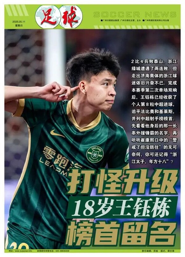At just 18 years old, Wang Yudong has emerged as the breakout star of the 2025 Chinese Super League season, currently sitting atop the scoring charts with eight goals — tied with foreign veterans such as Tianjin’s Robert Gils and Beijing Guoan’s Fabio. The Zhejiang FC forward netted twice in the recent 4-2 away defeat to Shandong Taishan, underlining his growing influence and clinical touch.