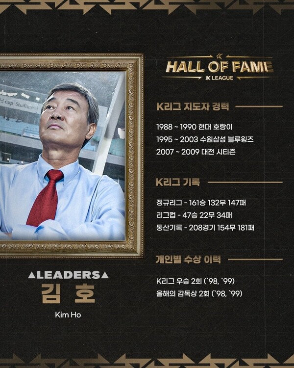 As the architect of Suwon Samsung's rise to power, Kim Ho guided the club to back-to-back league titles in 1998 and 1999 and two consecutive Asian club championships. With 208 victories across three clubs, he ranks third all-time in K League wins. Known for his tactical acumen and player development, Kim’s influence endures in the many stars who blossomed under his guidance and in Suwon’s continued stature as a K League powerhouse.